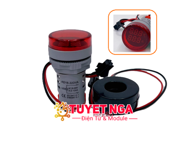 AD16-22DVA Đồng Hồ Điện Áp Dòng Điện AC 22mm là một thiết bị kết hợp giữa đèn cảnh báo LED và hiển thị số điện áp – dòng điện dạng mini. Sản phẩm thường đi kèm với một biến dòng (CT) dạng vòng, dùng để đo dòng điện gián tiếp mà không cần mắc nối tiếp vào tải. Thiết bị có thể hoạt động trong dải điện áp rộng (AC 20–500V) và đo dòng lên tới 100A.