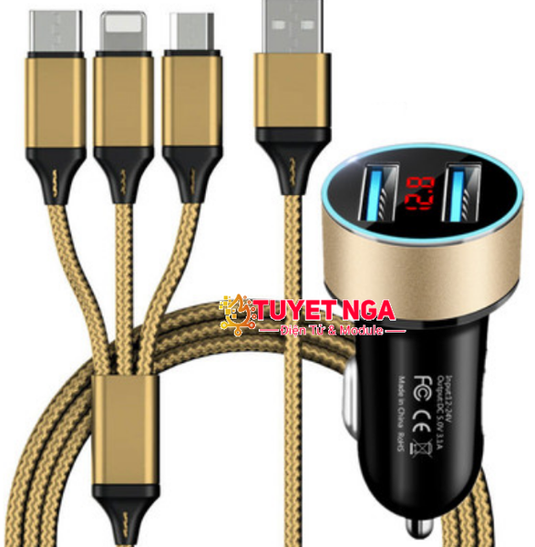 Cốc Sạc Xe Hơi 3.1A Dual USB Kèm Dây Ra 3 Cổng Sạc