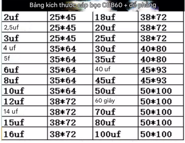 Capacitance (dung lượng) hỗ trợThường 1 µF – khoảng 60 µF (tùy hãng)Phổ dung hơn: từ vài µF tới 100 µF hoặc hơn