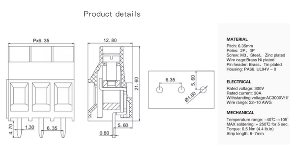 KF635 Domino 2 Chân 6.35mm chịu tải 300V 30A