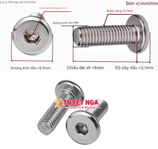 M4x8 Vít Lục Giác Đầu Bằng M4 Dài 8mm Inox 304