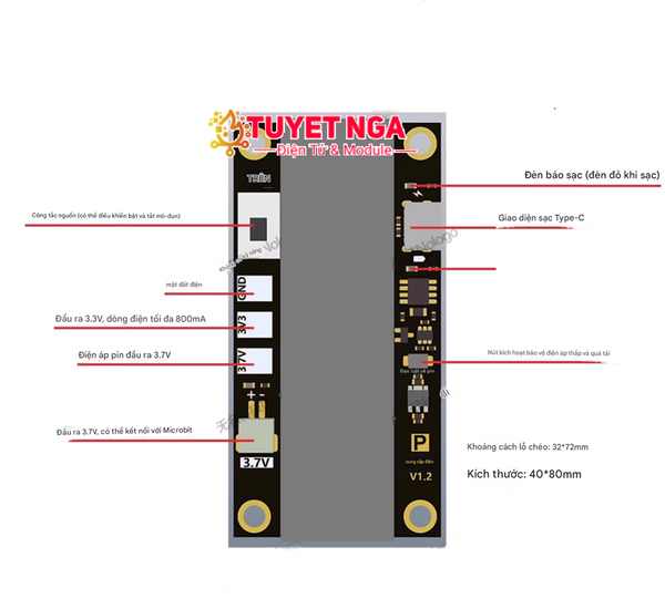 có ưu điểm đầu ra 3.3V 800mA và 3.7V sử dụng chip sạc TP4056, sạc có bảo vệ