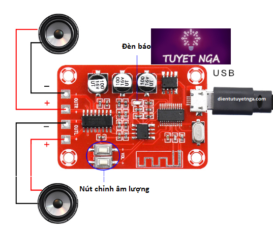 sử dụng ic pam8403 với công suất mỗi ngõ ra là 5w.Tích hợp 2 nút nhấn tăng chỉnh vol dễ dàng.