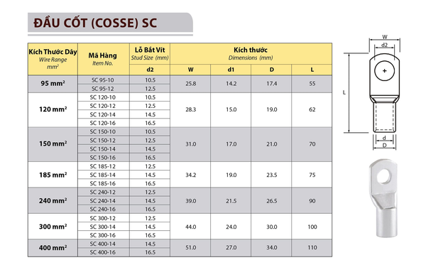SC240-12 Đầu Cos Trần 240-12 Vít M12 mũ chụp cos V200 tiết diện dây 240mm
