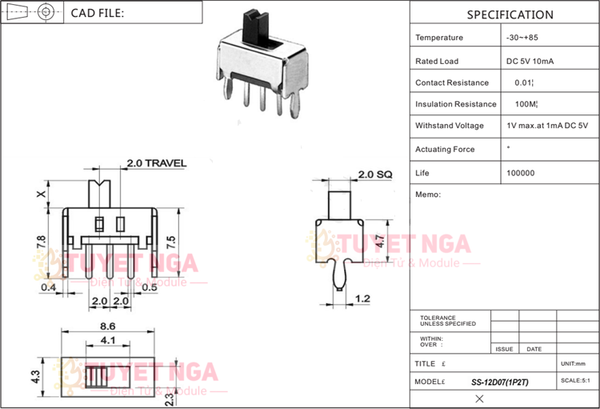 SS-12D07 Công Tắc Trượt 3 Chân 2 Vị Trí 0.3A 50VDC