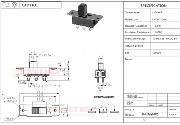 SS-12F15 Công Tắc Trượt 3 Chân 2 Vị Trí 0.3A 30VDC